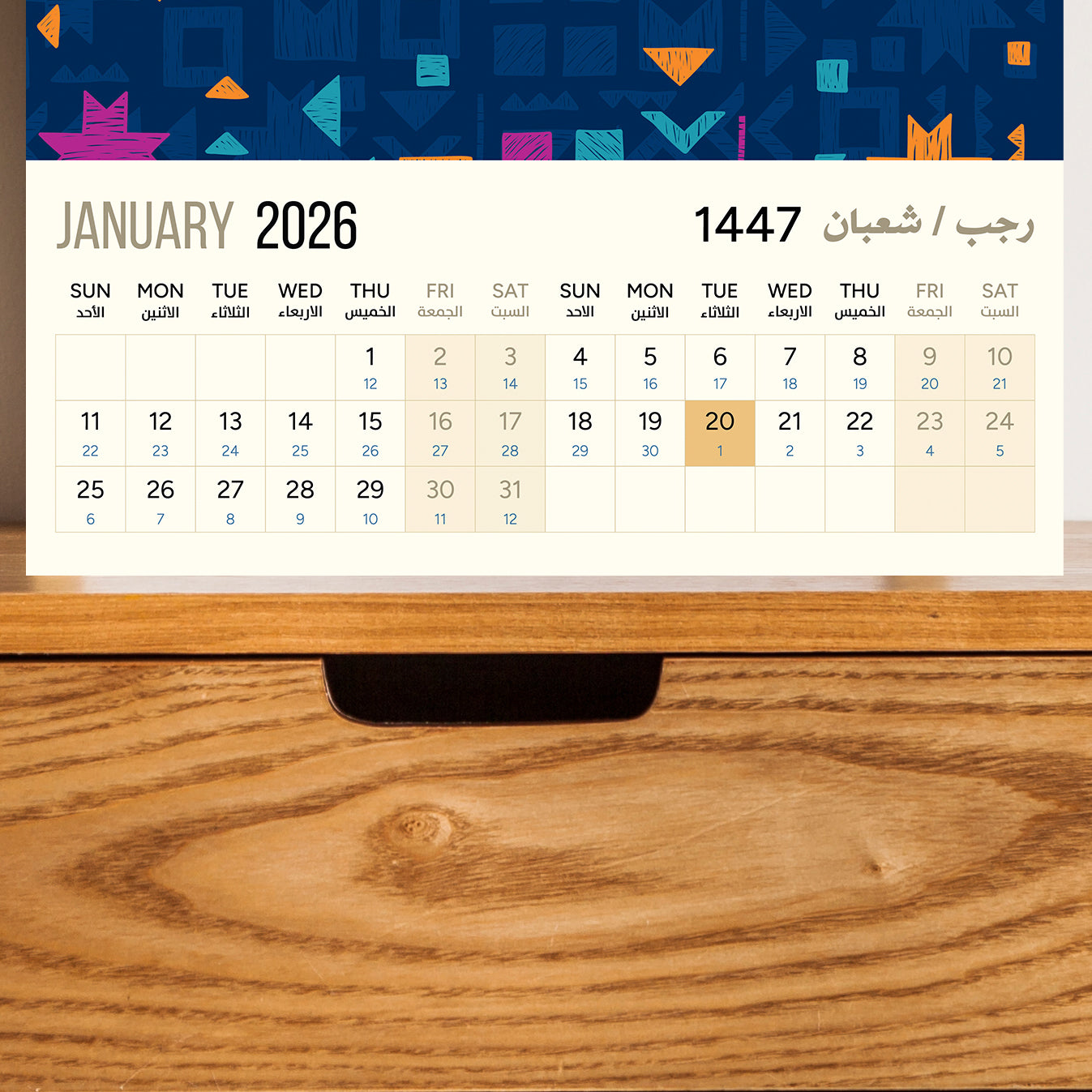 Bring beauty and organization to your space with Sa3eeda’s 2026 wall calendar. Featuring a single elegant design printed on durable, plastic-laminated card stock (30×47 cm), this calendar is both functional and decorative. It includes 12 monthly sheets (each 30×12 cm) displaying both Gregorian and Hijri dates side by side perfect for families who value cultural and spiritual alignment. A joyful blend of art, tradition, and practicality, this calendar makes a thoughtful gift or a vibrant addition to your home or office wall.