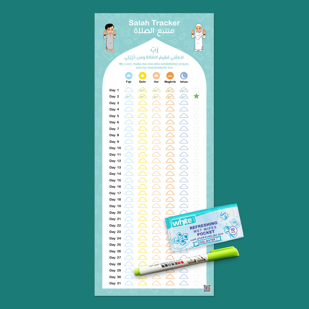 شجّعوا أطفالكم على أداء صلواتهم الخمس مع ملصق "مُتابعة الصلاة" الجذاب. الخامة: ورق مقوى مزود بلاصق من الخلف. مقاسه ١٥.٥ × ٣٦.٥ سم. يُذكّركم هذا الملصق بالصلوات اليومية، برسوماته الملونة، وهو مثالي للاستخدام في المنزل أو الفصل الدراسي. كهدية خاصة ، قمنا بإضافة مناديل مبللة وقلم ، حتى يتمكنوا من تحديث المتتبع الخاص بهم بسهولة حسب الحاجة. ساعدوا أطفالكم على بناء علاقة وطيدة مع إيمانهم. علّقوه على الحائط ليحصلوا على إلهام وتوجيه يومي!