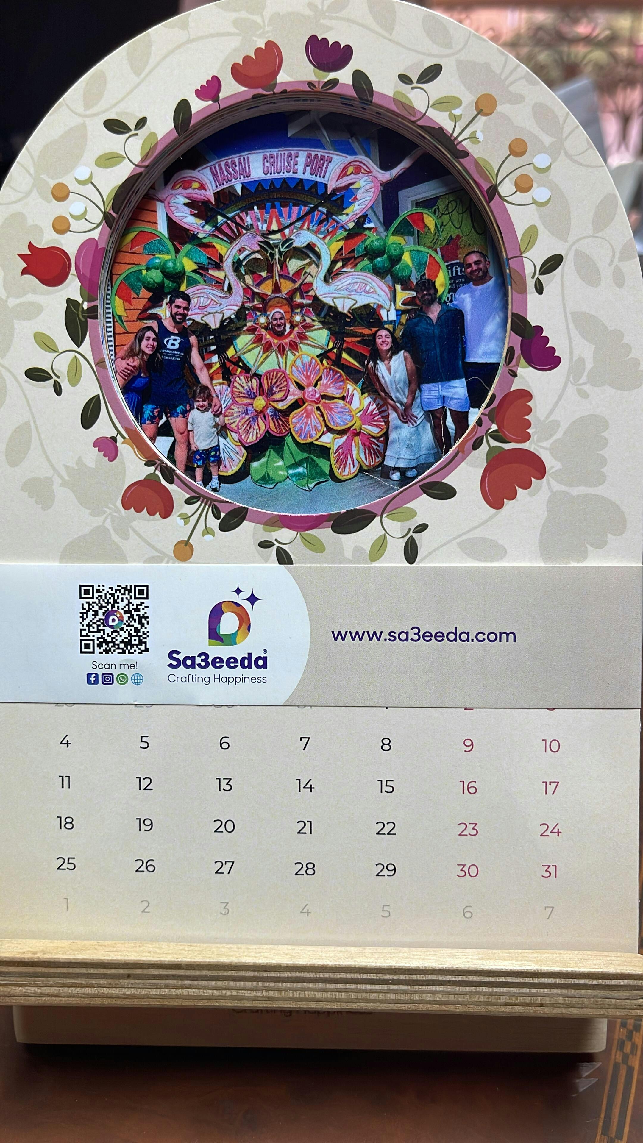 Celebrate a cherished moment all year long with Sa3eeda’s new “Photo of the Year” desk calendar. This artistic piece features 12 glossy, card stock monthly sheets displayed on a natural wooden stand. A circular cutout at the top showcases a personal photo chosen by the customer, turning the calendar into a heartfelt keepsake and stylish décor for any desk or cozy corner. Perfect for gifting, memory keeping, or adding a personal touch to your workspace.